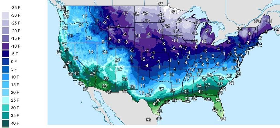 Outre les précipitations, les médias font état de températures ressenties descendant en dessous de –45 degrés Celsius dans les États du Dakota et du Minnesota, dans le nord du pays.